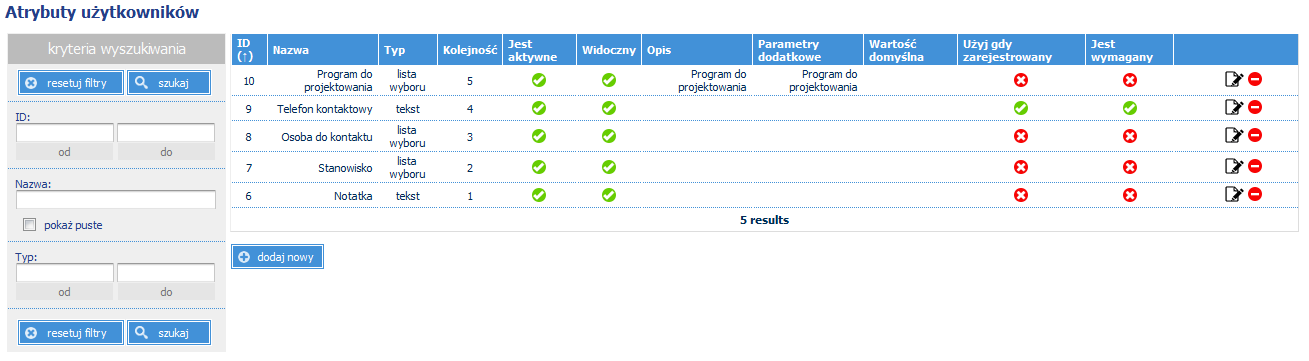 Tabela przedstawiająca istniejące atrybuty użytkowników. Mamy możliwość definiowania własnych atrybutów użytkowników poprzez przycisk "dodaj nowy" znajdujący się pod tabelą.