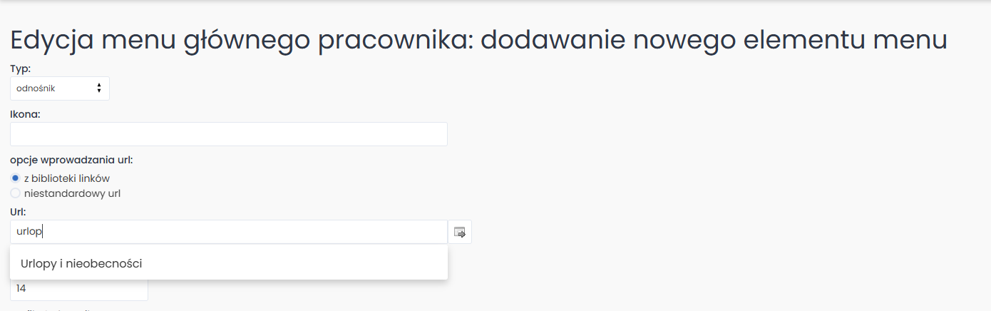 Powyższe linki są możliwe do konfiguracji z poziomu Parametry systemu -> Parametry pracowników -> Edycja menu pracownika -> Dodaj nowy