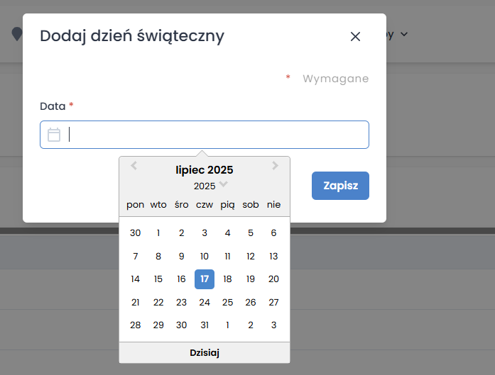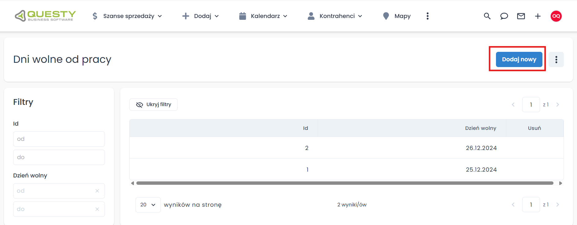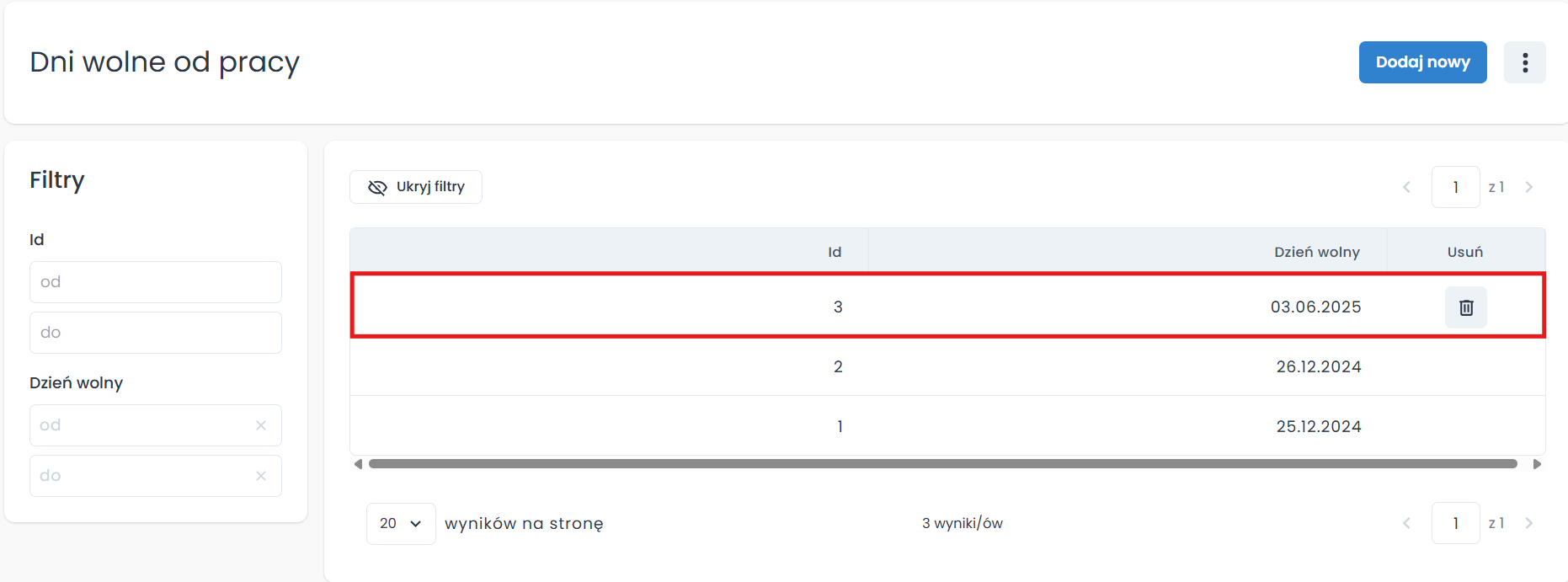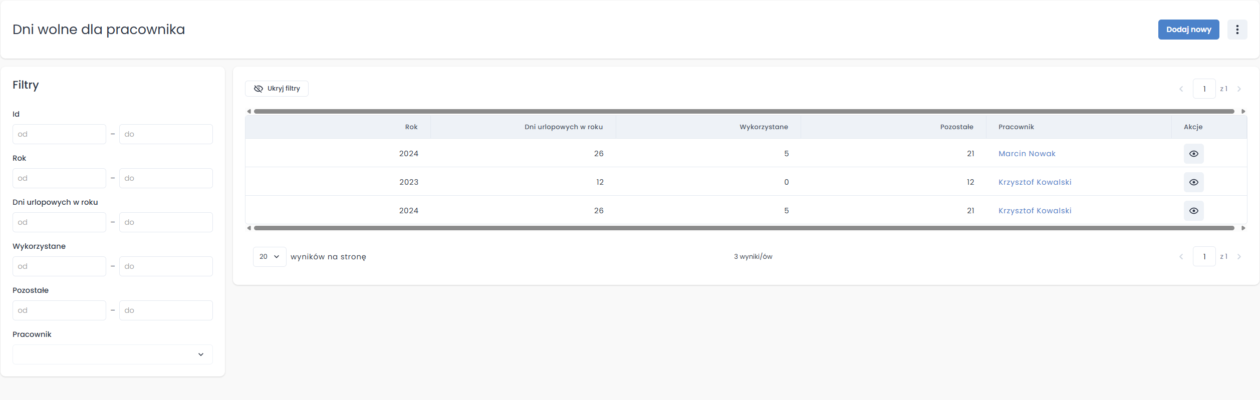 ABy dodać nowy dzień wolny od pracy nalezy uzyć przycisku "Dodaj nowy".