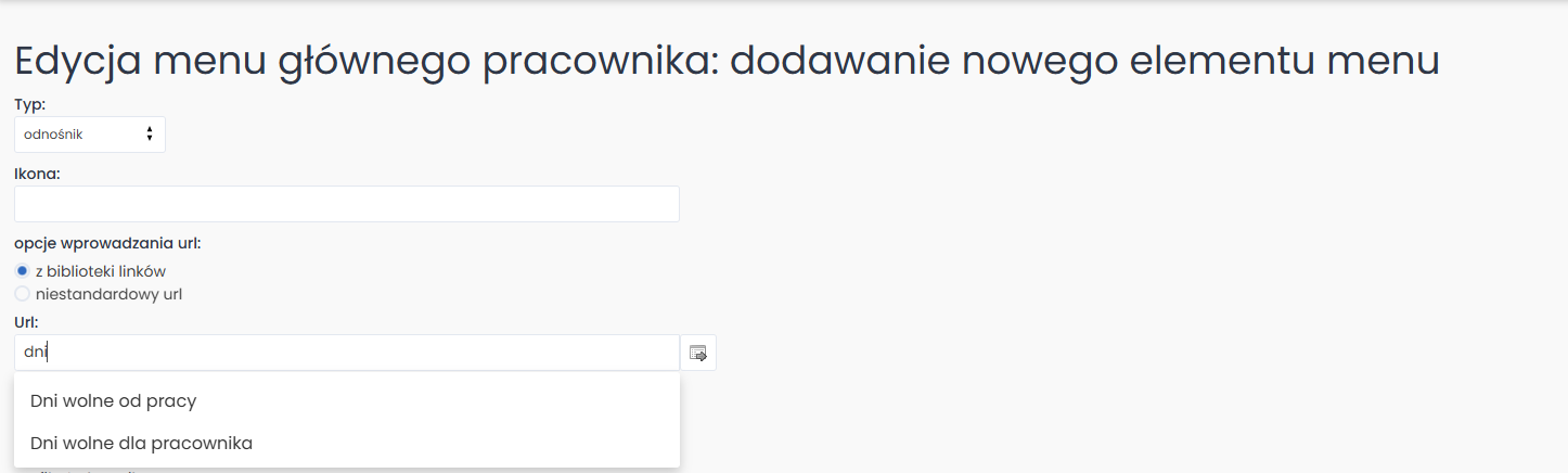 Powyższe linki są możliwe do konfiguracji z poziomu Parametry systemu -> Parametry pracowników -> Edycja menu pracownika -> Dodaj nowy