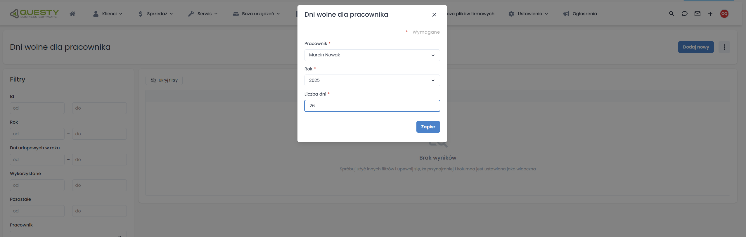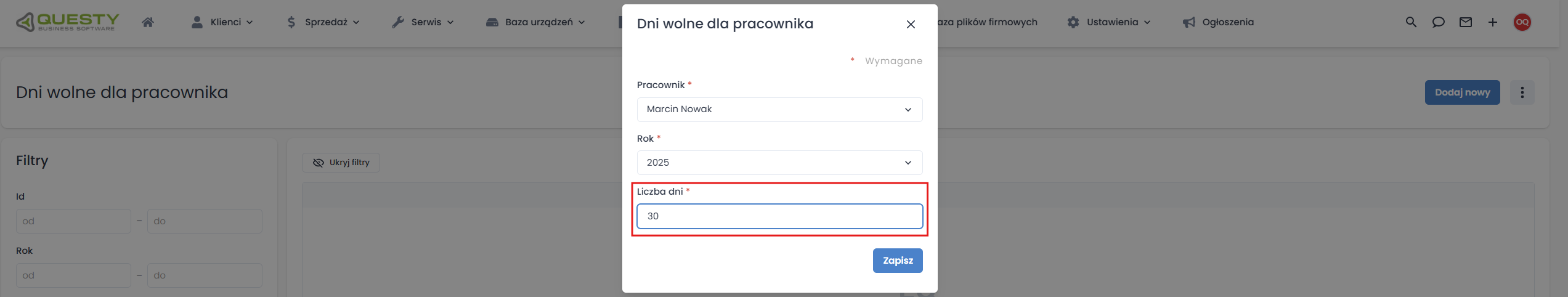Podczas ustalania dni wolnych dla pracownika na kolejne lata należy uzwględnić w polu "Liczba dni" dni, które nie zostały wykorzystane przez pracownika w poprzednim roku.