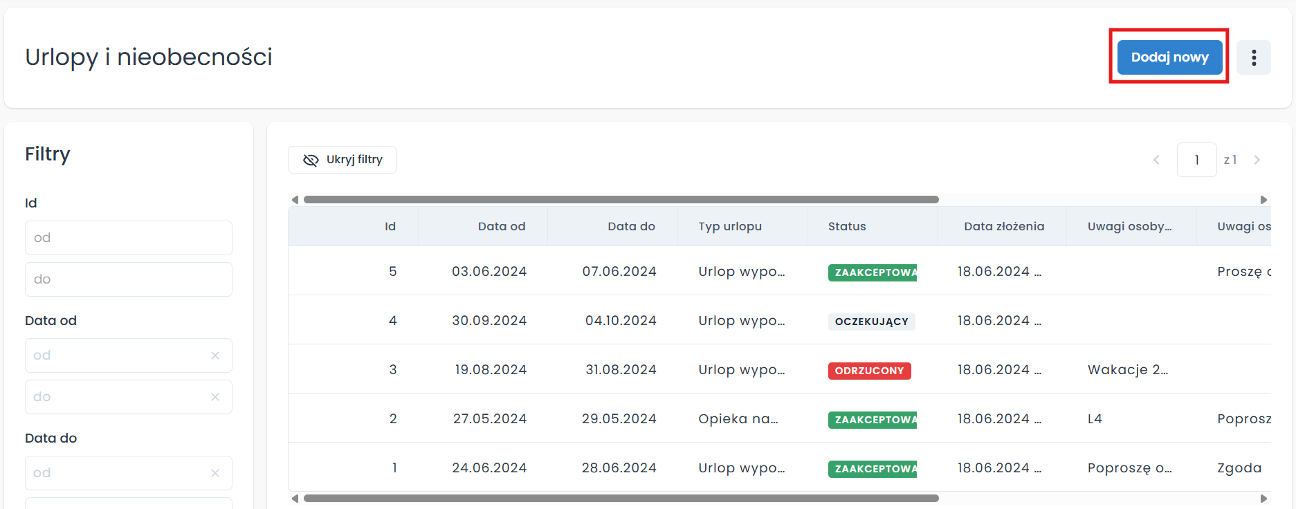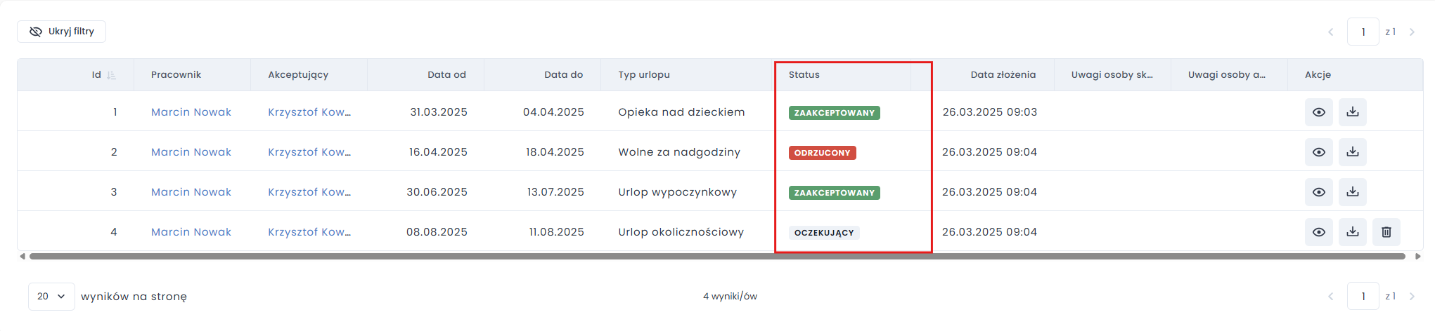 Statusy wniosków można sprawdzić na liście z wnioskami urlopowyumi:
