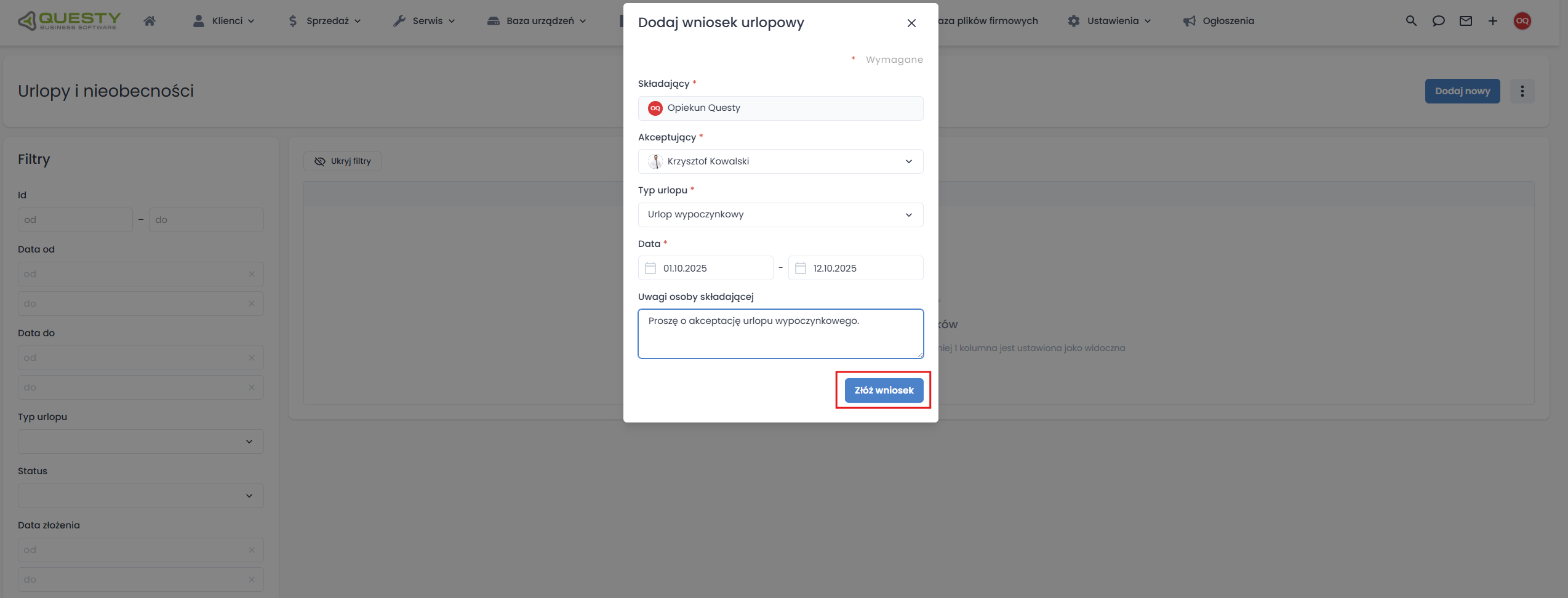 Użytkownicy maja możliwość dodania wniosku urlopowego z poziomu listy dostępnej pod adresem /userUserAbsence/list.