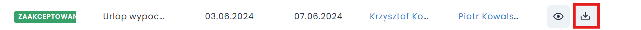 Pracownik z uprawnieniami do akceptacji lub odrzucania wniosków urlopowych po wejściu w ikonę z okiem ma możliwość skorzystania z przycisków "Akceptuj" lub "Odrzuć", a także dodanie uwag.