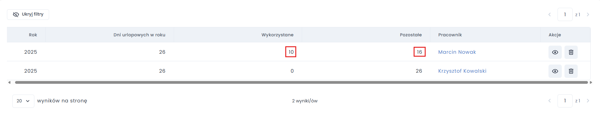 System zlicza wykorzystane oraz pozostałe dni urlopowe pracowników na podstawie zgłoszonych nieobecności o typie "Urlop wypoczynkowy". Jeśli pracownik wystawił w ostatnim czasie wniosek urlopowy na 5 dni, a jego liczba dni urlopowych to 26 dni to system odejmie liczbę 5 od 26. Otrzymamy wtedy liczbę pozostałych dni do wykorzystania przez pracownika w danym roku.