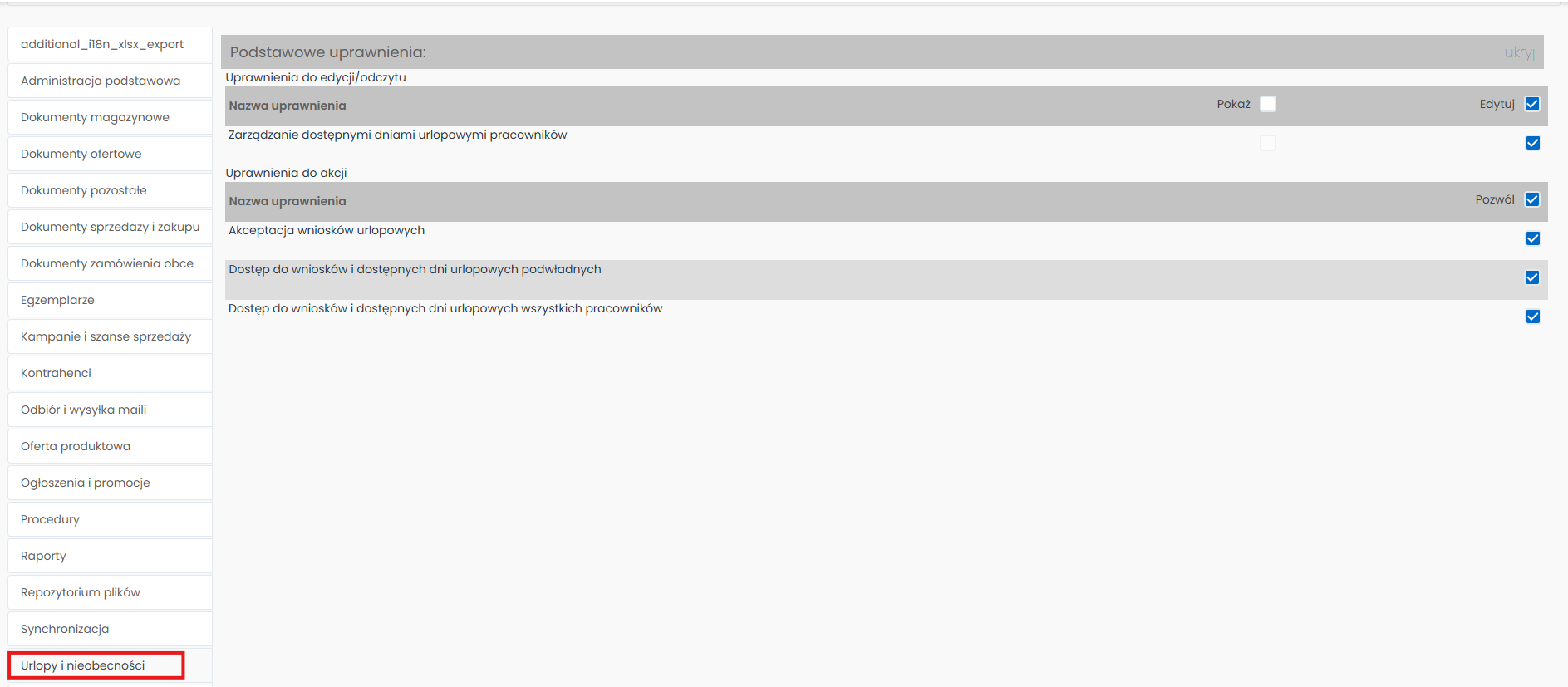 Zakładka dot. Urlopów i nieobecności pozwala na dodanie uprawnień do: