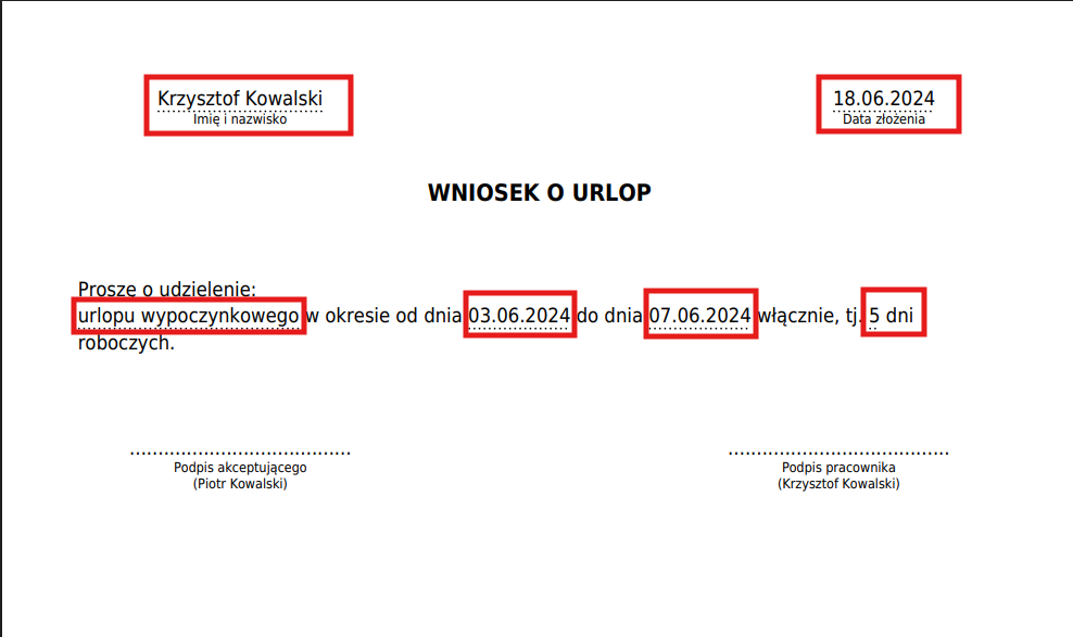 W przypadku konieczności przechowywania papierowych wniosków w siedzibie firmy użytkownicy mają możliwość pobrania pliku PDF wniosku i wydrukowania go. System przenosi podane przez pracownika dane na plik PDF.