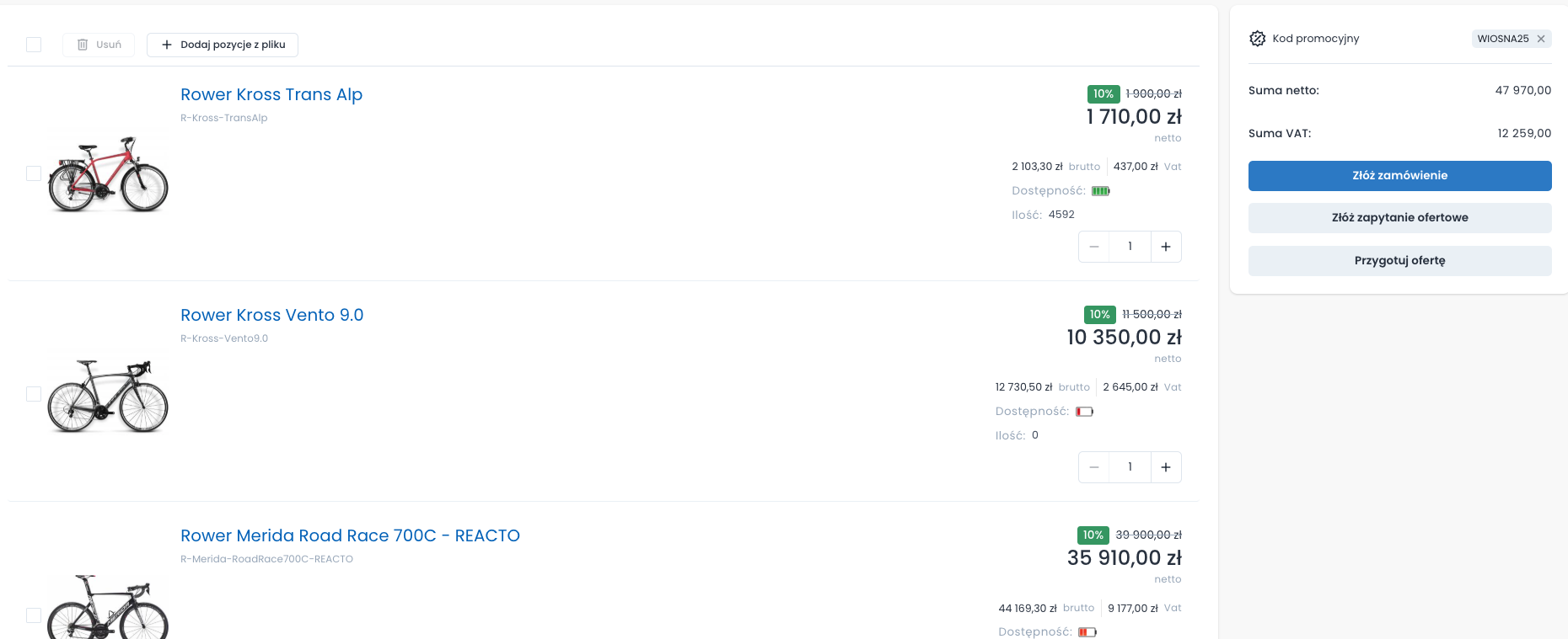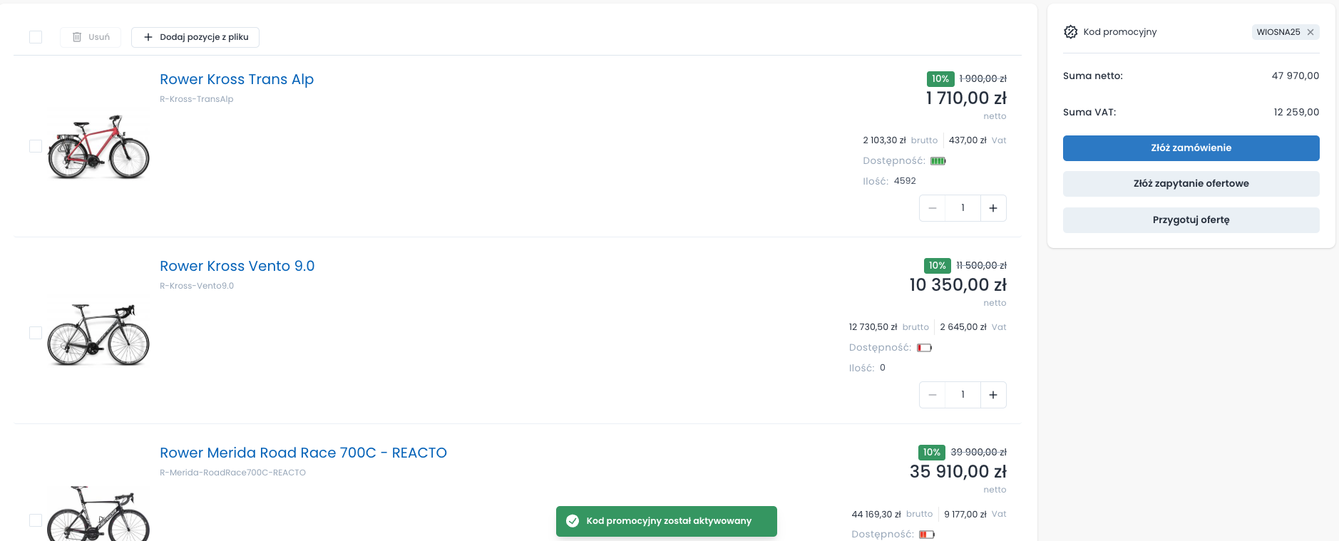 W przypadku pomyślnego aktywowania kodu rabatowego kontrahent otrzyma odpowiedni komunikat w koszyku, a ceny produktów zmienią się zgodnie z warunkami kodu.