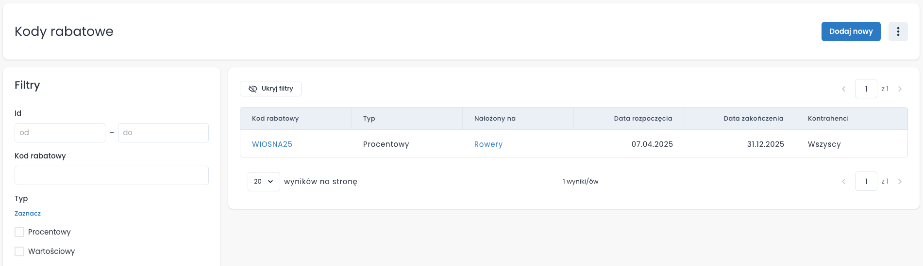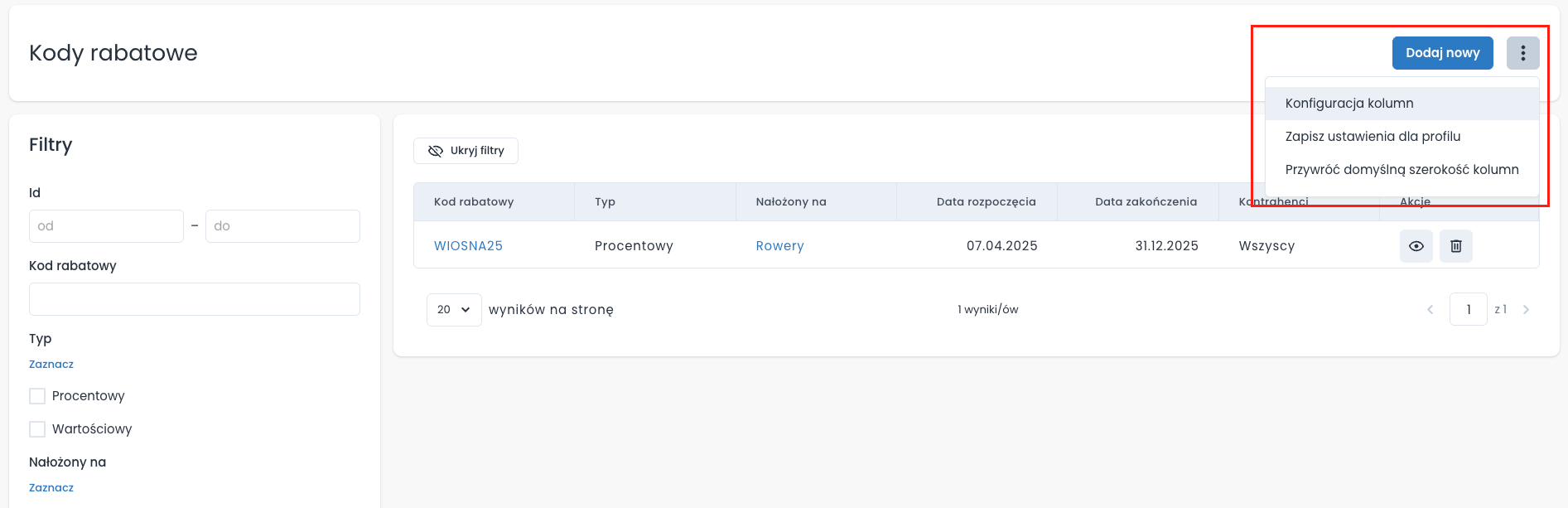 ID– unikalny numer kodu rabatowegoKod rabatowy– kod, który zdefiniował albo wygenerował użytkownikTyp– typ rabatu, możliwe jest zdefiniowanie kodu procentowego albo wartościowegoNałożony na– informacja czy kod rabatowy został nałożony na Wszystkie produkty, kategorię produktów lub wybrany produktWartość– wartość rabatu - procentowa lub wartościowa z zależności od wybranego typuData rozpoczęcia– początkowa data obowiązywania kodu rabatowegoData zakończenia– końcowa data obowiązywania rekordu rabatowegoLimit wykorzystania- definiuje ile razy kod może zostać wykorzystany przez kontrahentaData utworzenia- data utworzenia kodu rabatowegoTwórca- użytkownik, który zdefiniował lub wygenerował kod rabatowyProdukty- kolumna uzupełnia się wartościami jeśli kod rabatowy został zdefiniowany na konkretne produktyWykluczone- kolumna uzupełnia się wartościami jeśli z kodu rabatowego zostały wykluczone produktyKategorie- kolumna uzupełnia się wartościami jeśli kod rabatowy został zdefiniowany na kategorie produktoweKontrahenci- kolumna prezentuje kontrahentów, dla których został zdefiniowany kod rabatowy z opcją "Wszyscy"Akcje- wyświetlone są tutaj akcje możliwe do wykonania względem wybranego kodu rabatowego: możliwość podglądu lub usunięcia poprzez przycisk