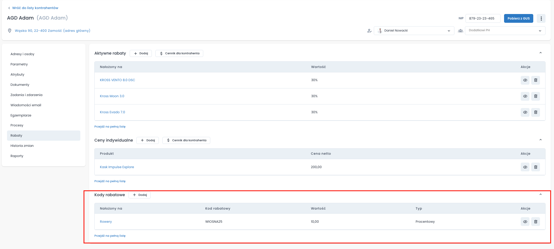 W karcie kontrahenta, w zakładce "Rabaty" znajduje się lista przypisanych do kontrahenta kodów rabatowych wraz z możliwością dodania nowego kodu. Lista prezentuje 5 ostatnich kodów z opcją przejścia do pełnej listy kodów rabatowych