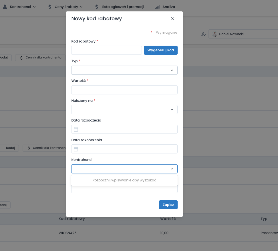 Kliknąć przycisk Dodaj nowy znajdujący się po prawej stronie nad listą rabatów. Po tej akcji, ukaże się modal w którym należy uzupełnić wymagane pola.
