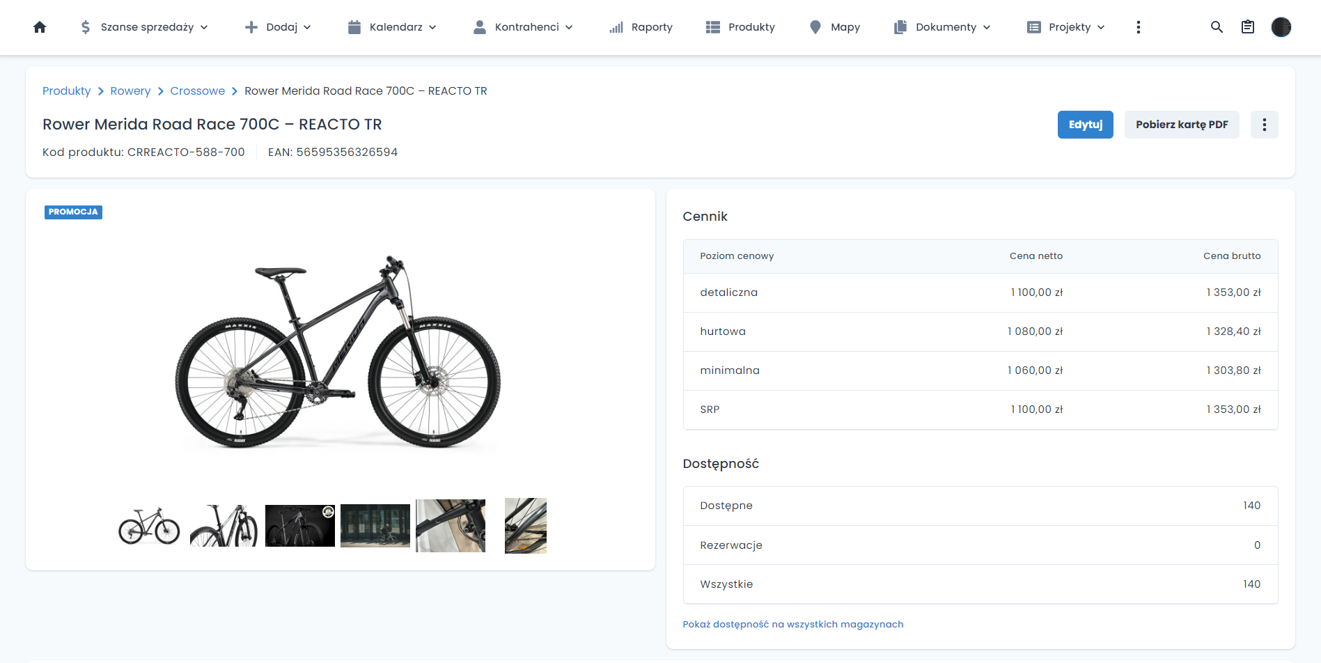 W tym momencie system przekieruje Cię na widok edycji karty produktu. Widać na nim dodany przelicznik. Od tego momentu możesz już wystawiać dokumenty ofertowe z możliwością zmiany jednostki podstawowej dla tego konkretnego produktu.
