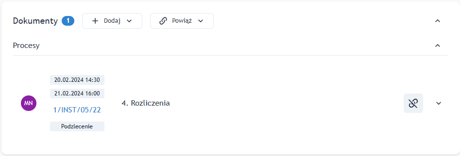 Znajdziemy tutaj dokumenty powiązane z procesem. Możemy również skorzystać z dodatkowych akcji: