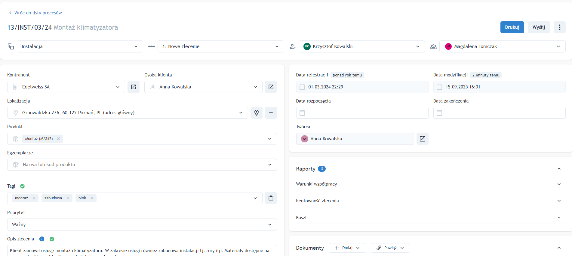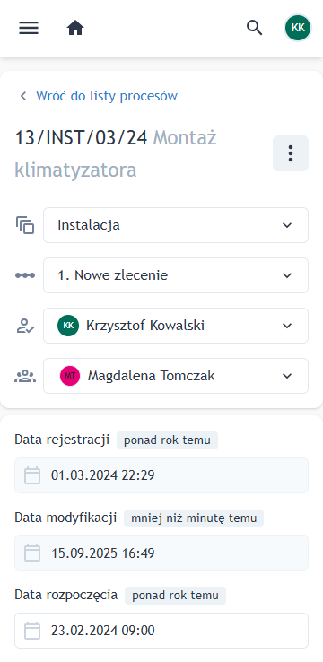 Widok karty procesu służy do zarządzania danym zleceniem. Widok jest w pełni responsywny i pozwala na dostęp zarówno z urządzeń mobilnych jak i większych ekranów.